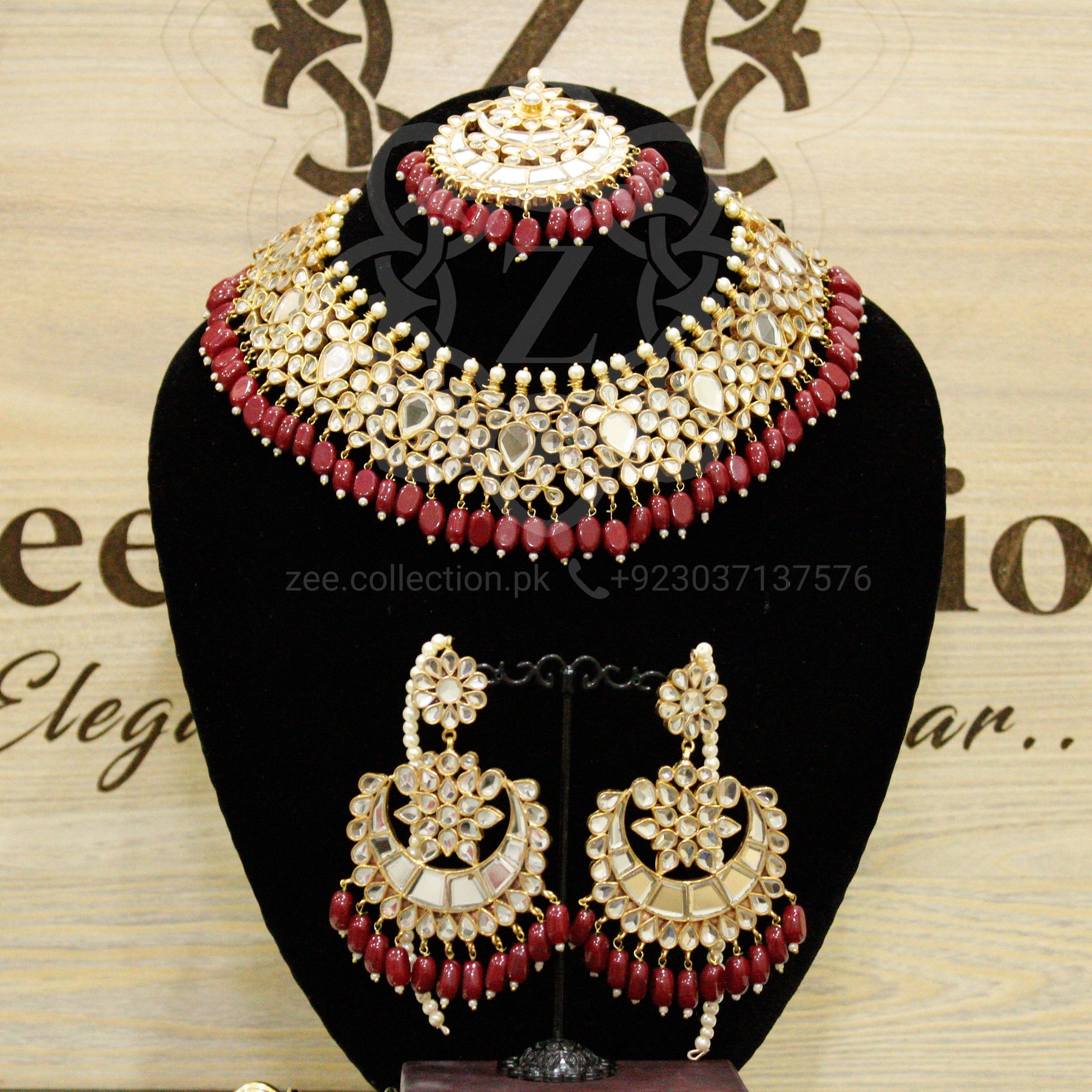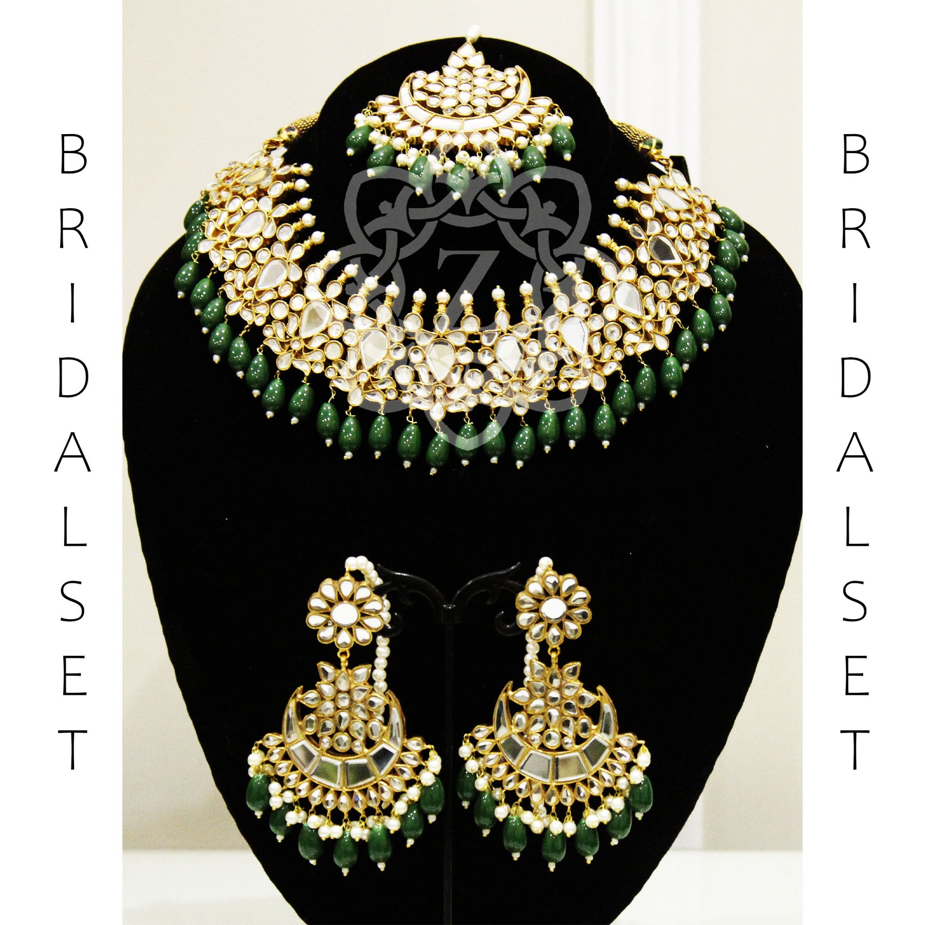 minal kundan birdal set is a trendy piece of art from house of zee collection. 22 karat gold polish with kundan stones make it supreme and elegance choice for a bridal set category. only make on order.