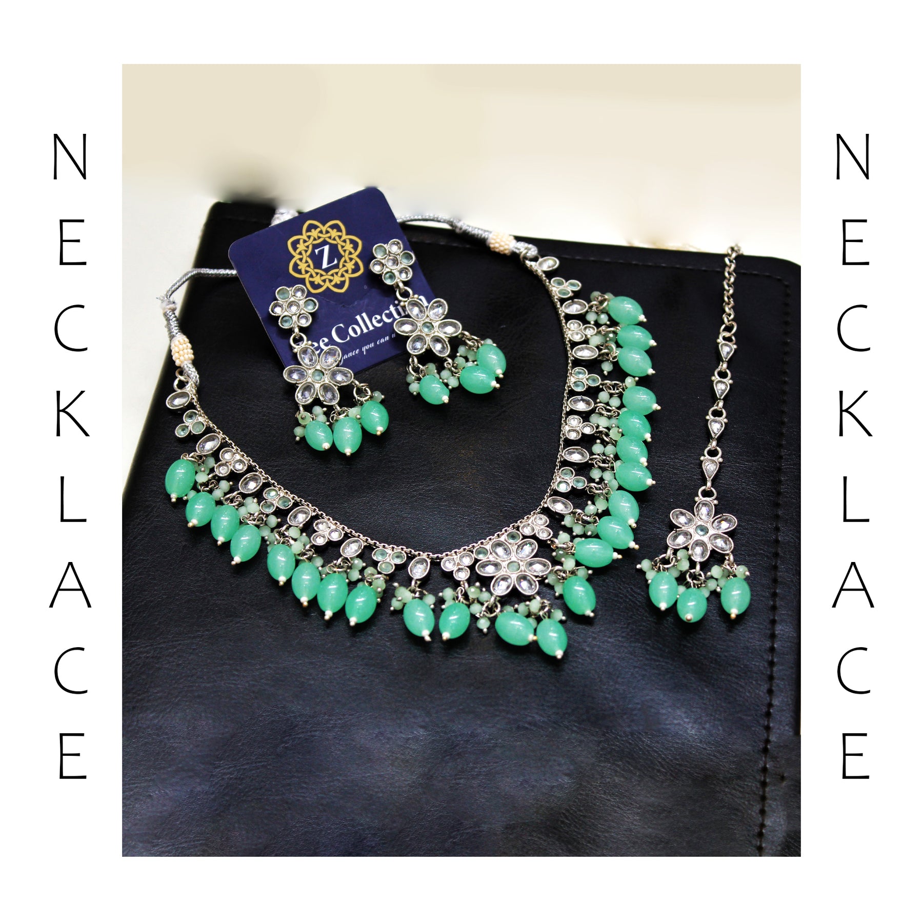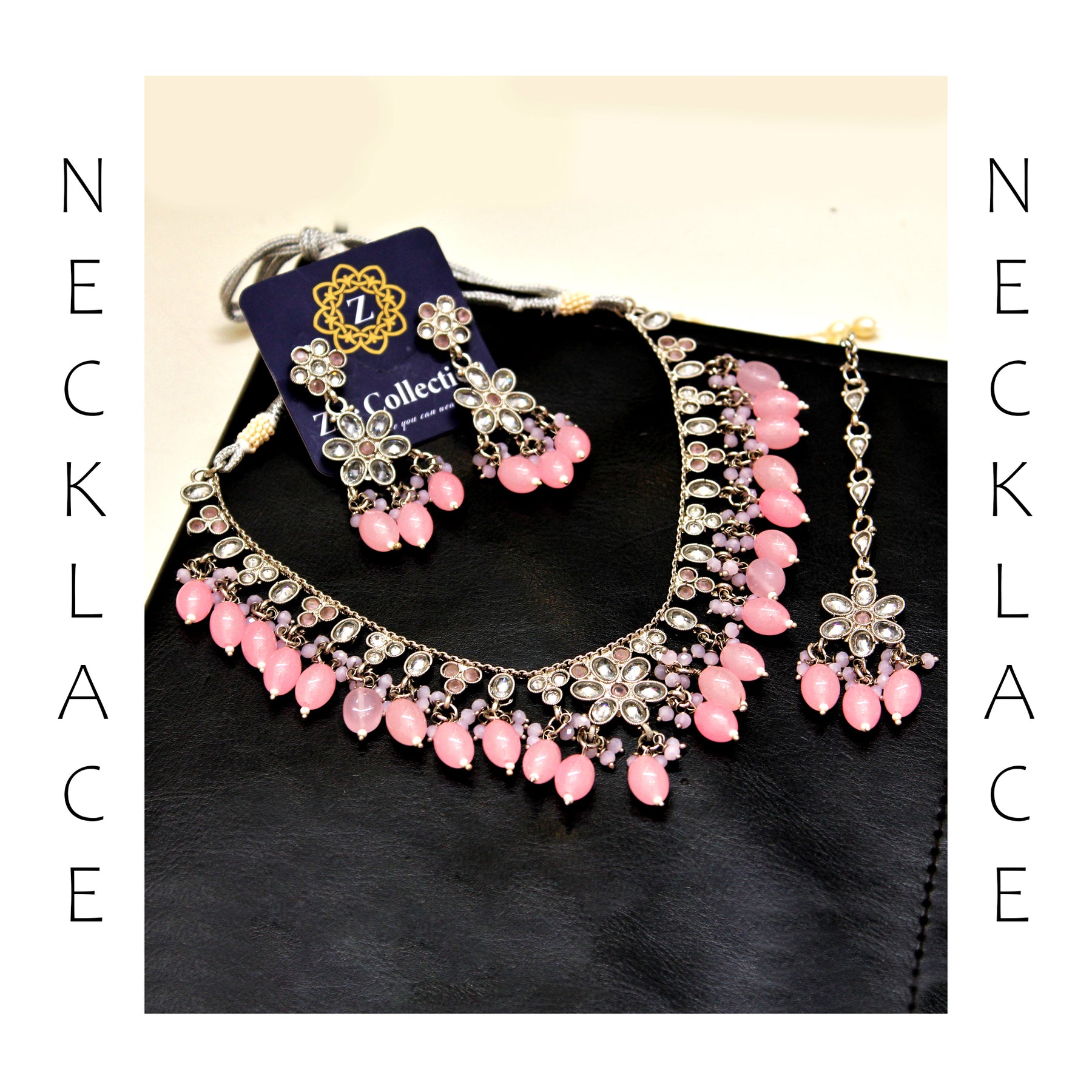 handcraft necklace with kundan stones and matching earrings and tikka also with attractive colors. high-quality brass as the base metal. approximate earrings length is 2.5″. .this set makes ideal statement wear for your festive and delighted days! don’t miss out on amazing jewels for special days!