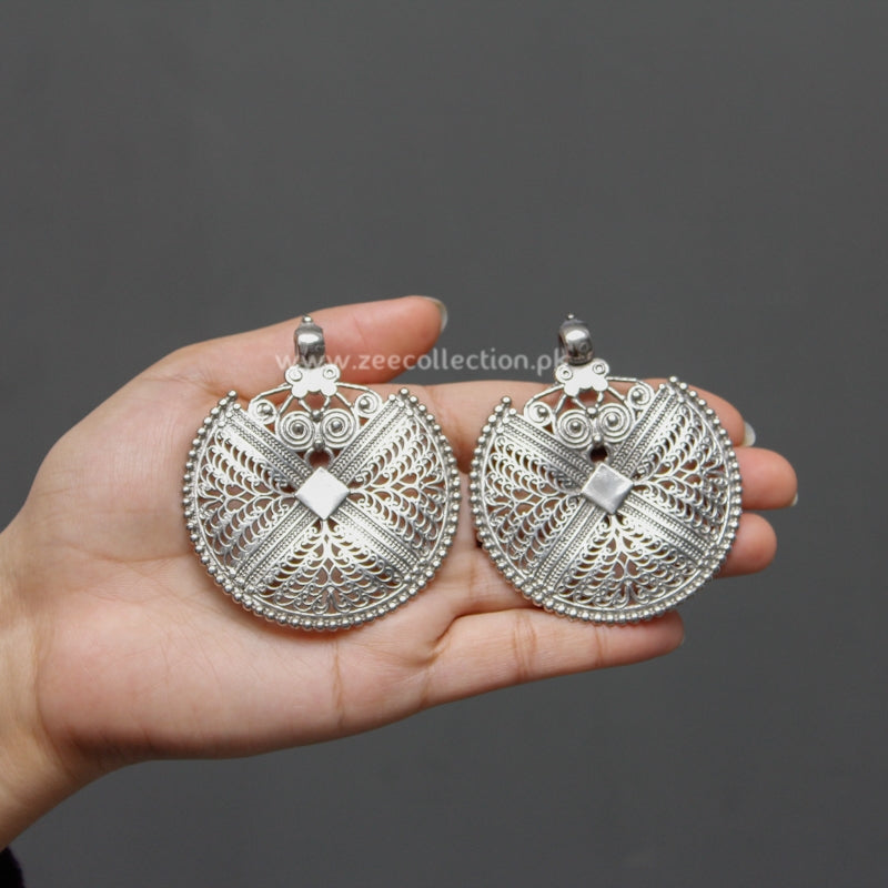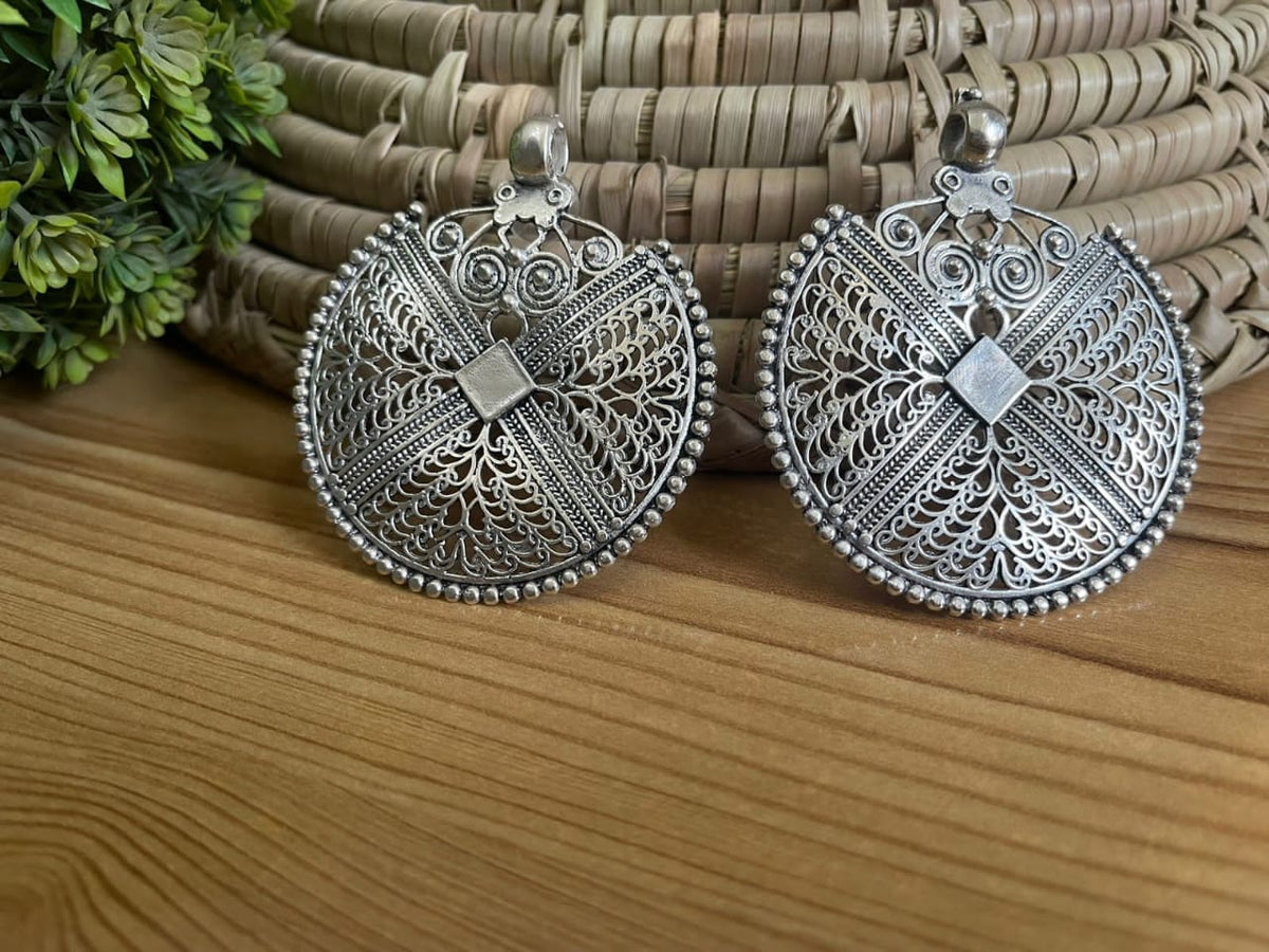 These Oxidized Polish Round Earrings are a must-have accessory for any fashion-forward individual. Handmade with a trendy afgani design, these earrings are not only stylish but also lightweight for comfortable wear. The oxidized polish gives them a unique, edgy look that will elevate any outfit.